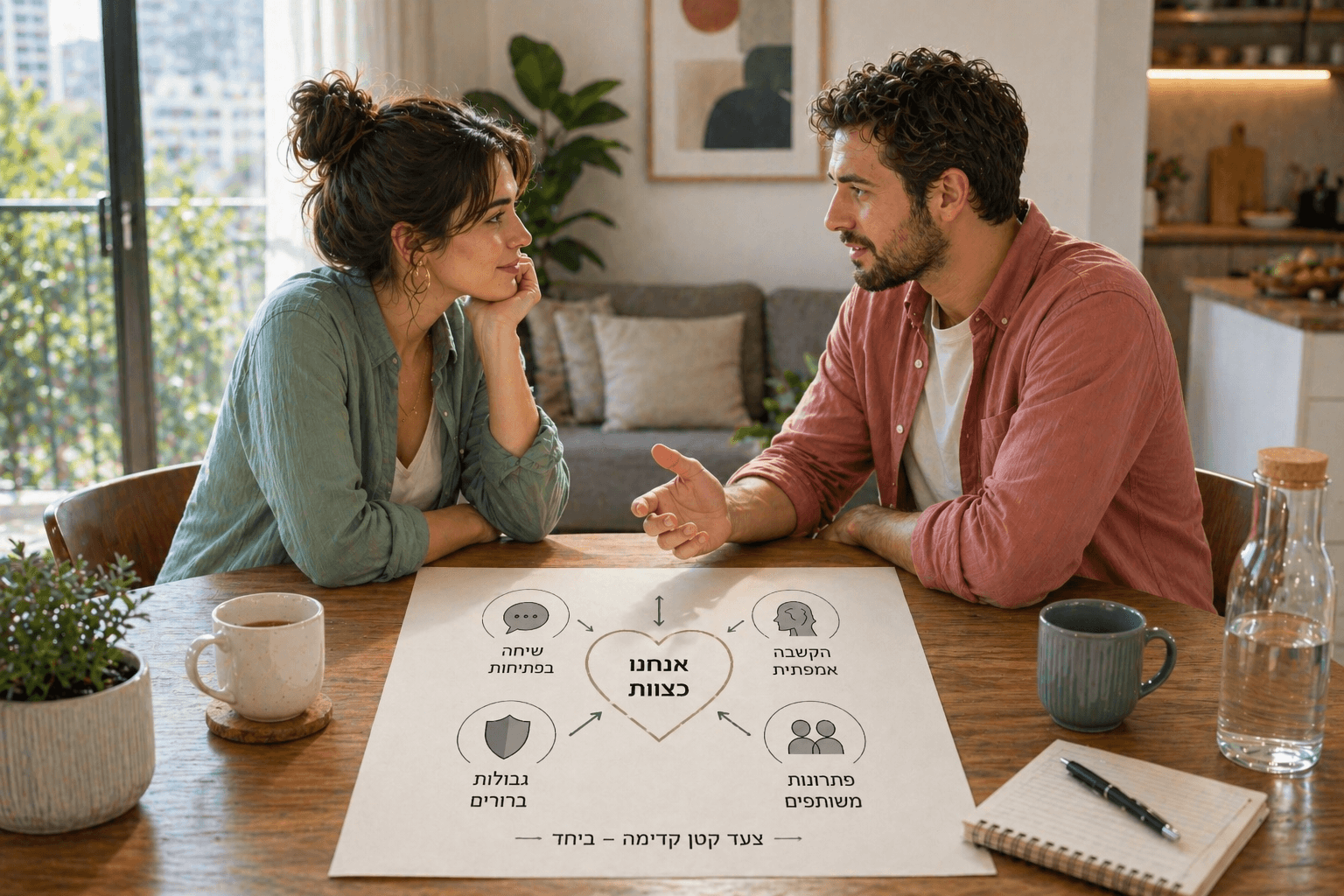 האתגר הוא ללמוד להיות שני אנשים שרואים זה את זו, בוחרים שוב ושוב בטוב של הקשר, ובונים קשר שיש בו יותר שקט, יותר שיתוף פעולה, ויותר מקום למה שחשוב לשניכם באמת.